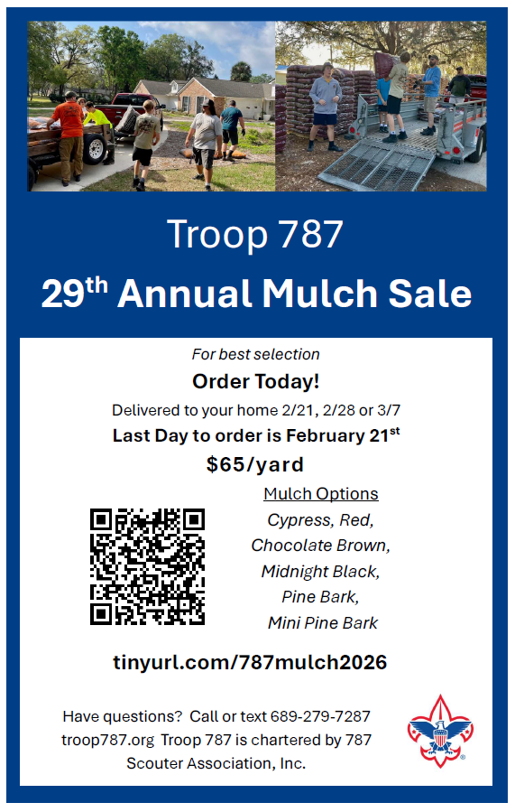 - Biggest change is that we have a new website (https://tinyurl.com/787Mulch2026) which makes the process of ordering mulch much easier.